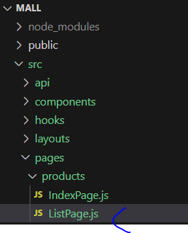 * 진행 중인 프로젝트는 리액트의 라우터를 사용해서 개발 구조를 생성해 두었기 때문에 개발은 페이지나 내용물에 해당하는 컴포넌트들을 추가하는 방식으로 개발하게 된다. 페이지와 관련해서 상품 관련된 기능은 pages 폴더 내에 products 폴더를 생성하고 관련된 템플릿 역할을 하는 IndexPage.js를 추가한다.
