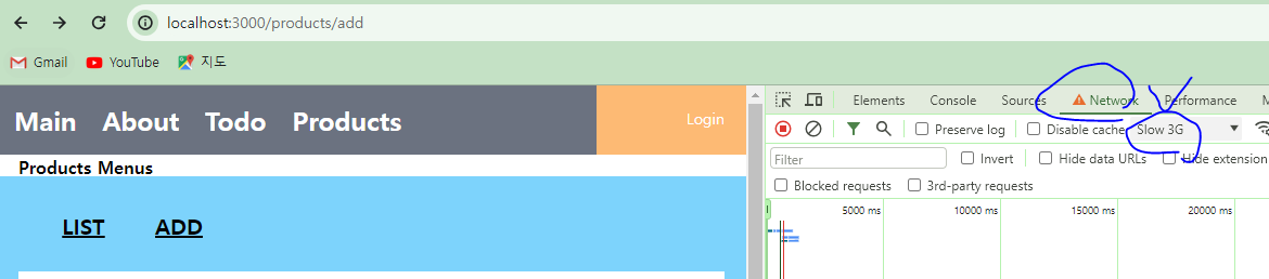 * 일부러 인터넷 속도를 느리게 하여 Loading 모달 창이 잘 뜨는지 확인하고 싶다면 다음의 옵션을 체크하여 테스트 한다.
