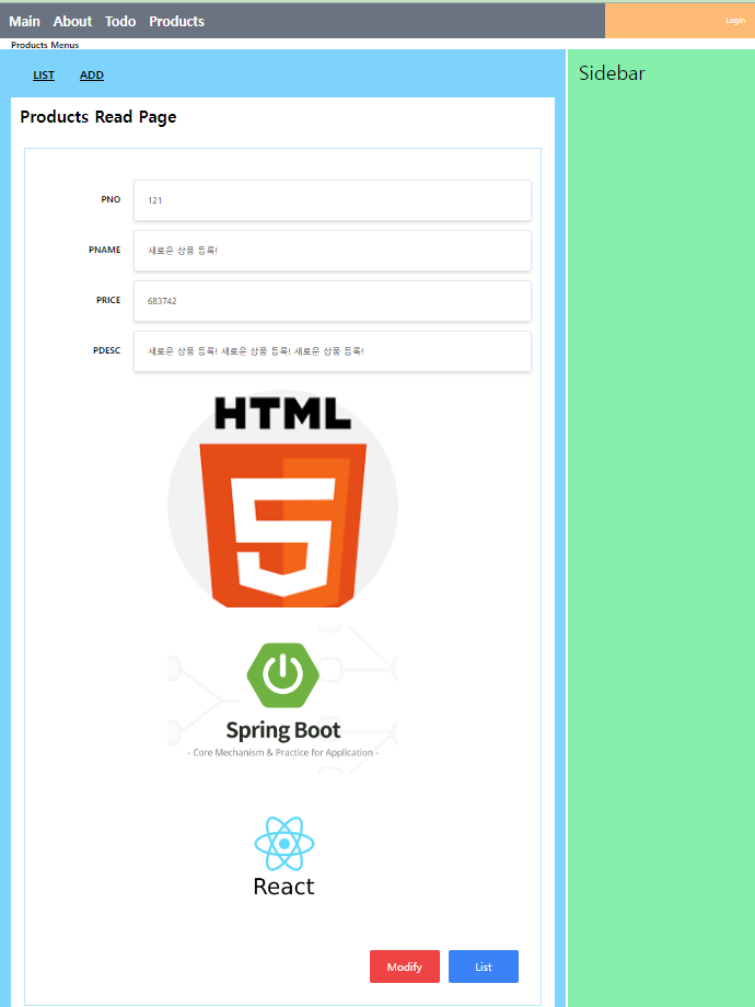 * 조회 화면에서는 상품정보와 첨부된 모든 이미지가 출력된다. 만일 이미지가 2개 이상인 경우에는 모든 이미지를 출력한다. 조회 화면의 아래 쪽에는 'Modify' 버튼과 'List' 버튼이 보이고 List 버튼을 클릭하면 원래 페이지로 이동이 가능하다(Modify에 대한 화면은 아직 구현 전이므로 에러가 발생한다).