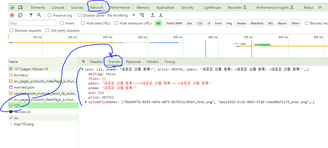* 브라우저의 개발자 도구에서는 해당 번호의 상품 데이터가 정상적으로 도착하는지 확인해 준다.