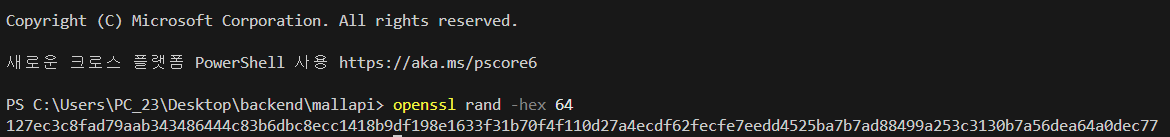 * 터미널에 다음 명령어를 입력하여 랜덤한 키를 생성해 보자.