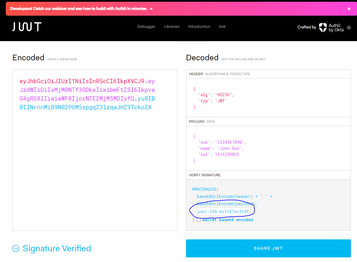 * 생성된 토큰의 검증은 jwt.io 사이트에서 확인할 수 있다.