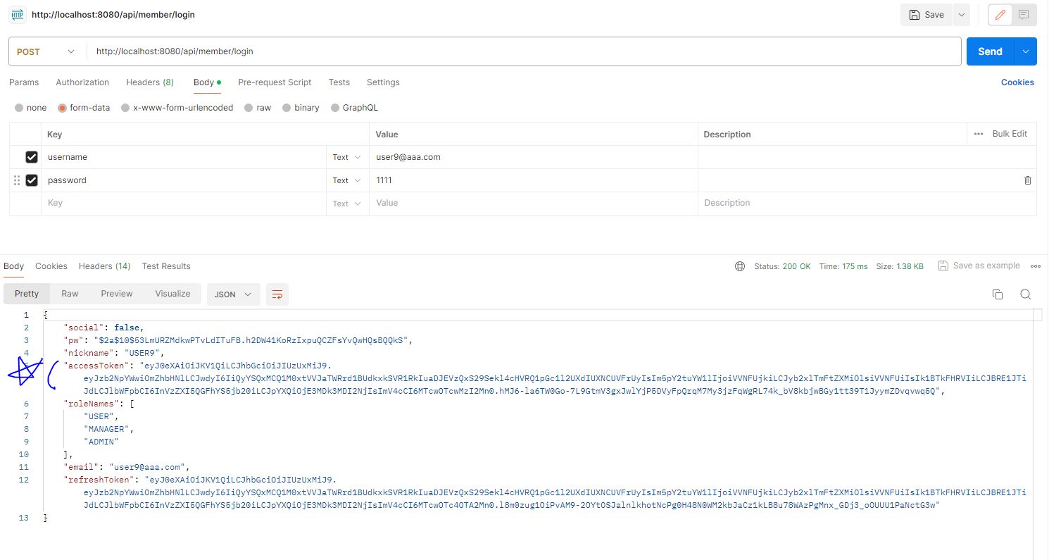 * 정상적인 결과를 확인하려면 우선 /api/member/login 에서 발생한 Access Token을 이용해야 한다(유효시간은 10분).