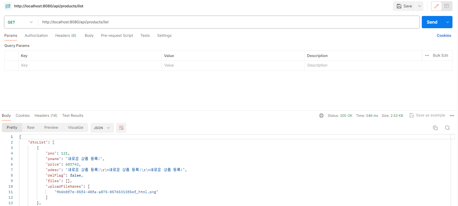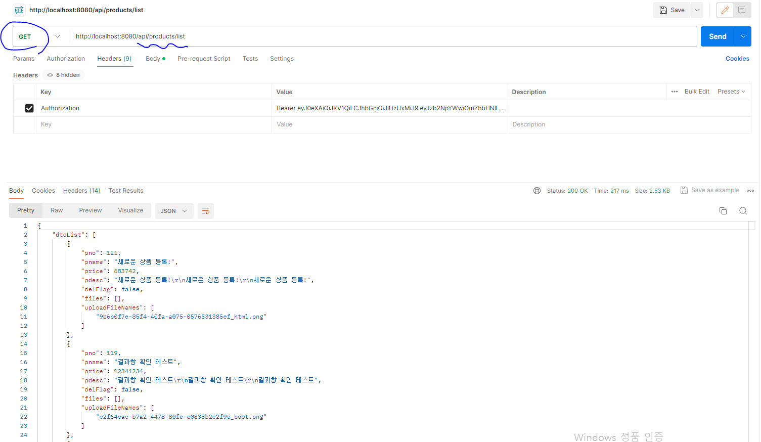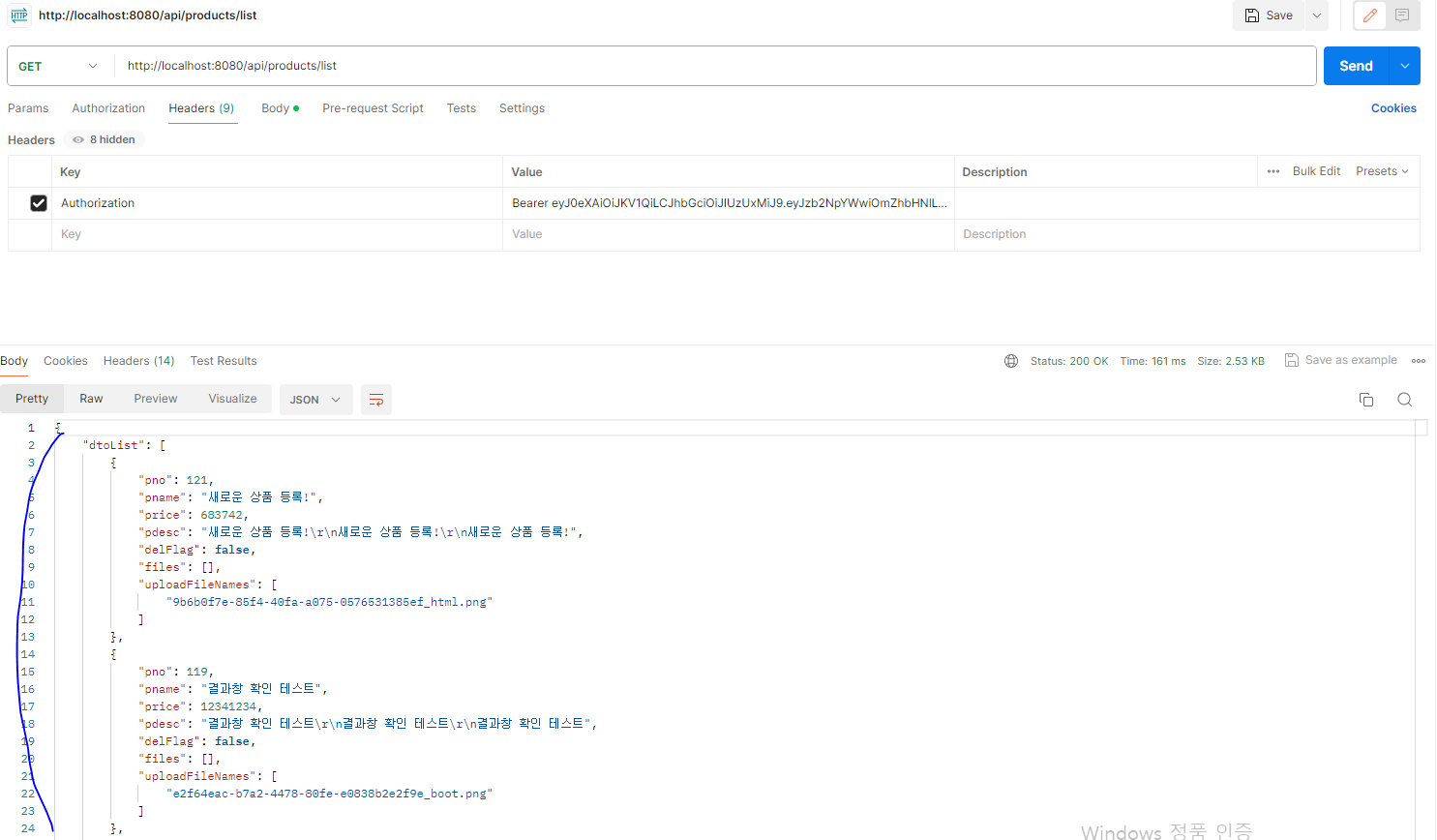 * 로그인 결과에서 발생한 accessToken의 내용을 복사해서 /api/products/list 를 호출할 때 'Authorization' Header 를 추가하고 'Bearer 토큰값' 을 설정한다(Access Token의 유효 시간이 10분이므로 주의, 만일 인증에 실패하면 재로그인 후 다시 시도한다).