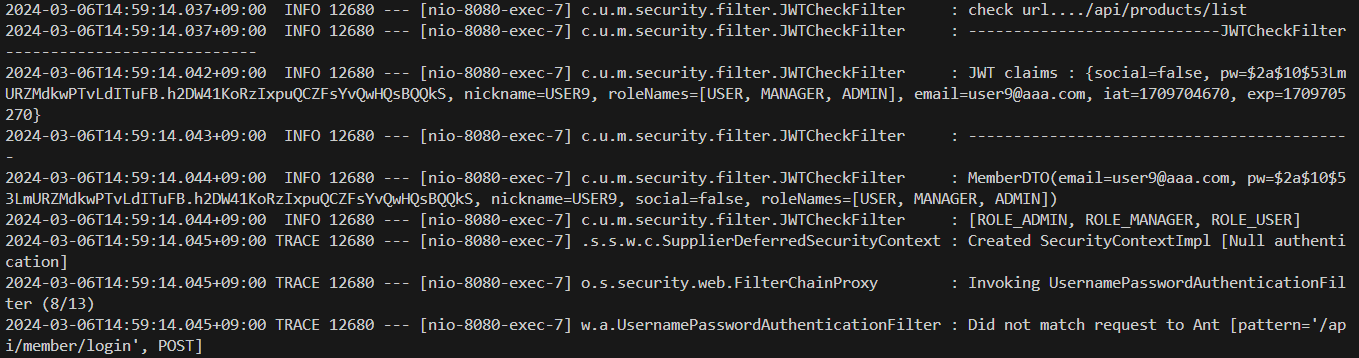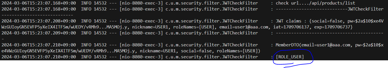 * 마지막으로 JWTCheckFilter에서는 JWT 인증 정보를 활용해서 사용자를 구성하고 이를 시큐리티에 지정해 주어야 한다. JWT 토큰 내에는 인증에 필요한 모든 정보를 가지고 있기 때문에 이를 활용해서 시큐리티에 필요한 객체(MemberDTO)를 구성한다.