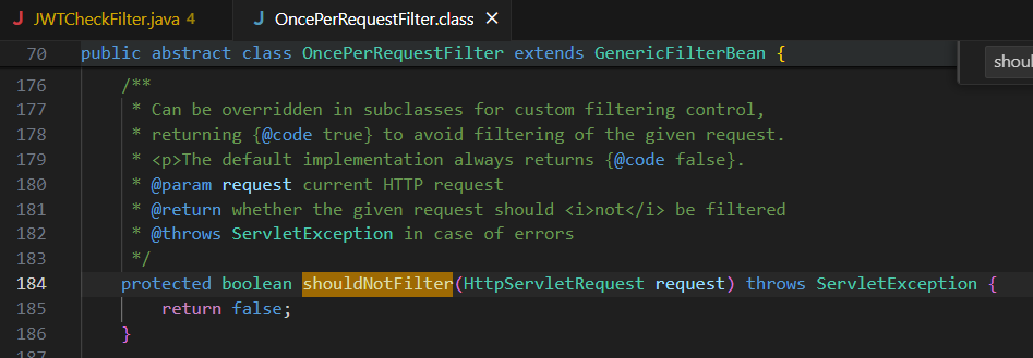 * JWTChainFIlter는 시큐리티에서 제공하는 OncePerRequestFilter를 상속하는데, 주로 모든 요청에 대해서 체크하려고 할 때 사용한다. shouldNotFilter() 는 OncePerRequestFilter의 상위 클래스에 정의된 메서드로 필터로 체크하지 않을 경로나 메서드(GET/POST) 등을 지정하기 위해서 사용한다.