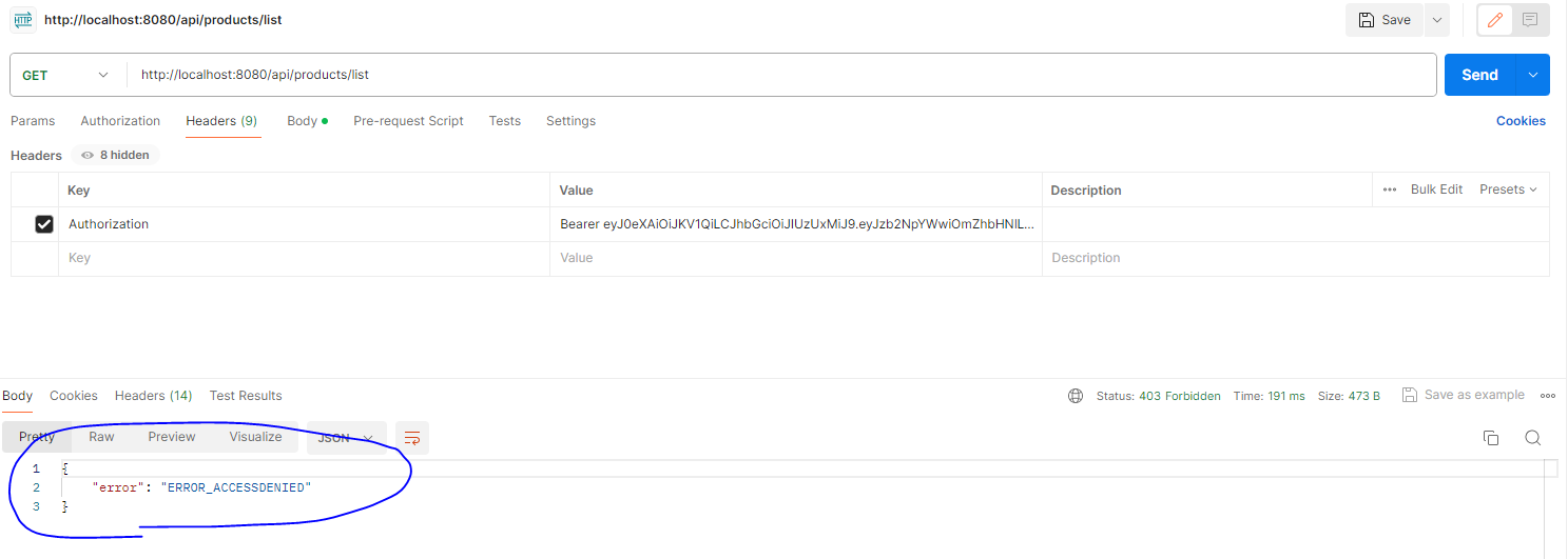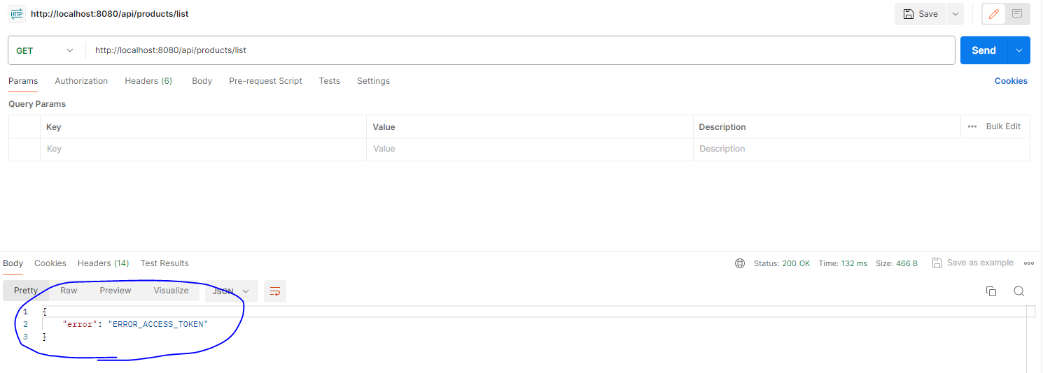 * 변경된 코드는 정상적인 경우라면 컨트롤러까지 호출이 가능하게 되고, Access Token에 문제가 있다면 JSON으로 에러 메시지가 전송된다. JWTFilter가 적용된 후에 Postman에서 /api/products/list 를 호출하면 아래와 같이 에러 메시지가 발생하는 것을 확인할 수 있다.