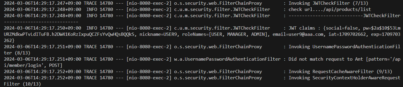 * 서버에서는 보호하고자 하는 자원에 대해서 Access Token을 체크해서 유효한 경우에 접근을 허용하는 구현이 필요한데 필터나 스프링 MVC의 인터셉터, 스프링 시큐리티의 필터를 활용해서 구현할 수 있다. 예제에서는 시큐리티를 이용하고 있으므로 필터를 추가해서 /api/todo/... 경로나 /api/products/... 경로에 접근할 경우 Access Token 을 확인하도록 구현한다.