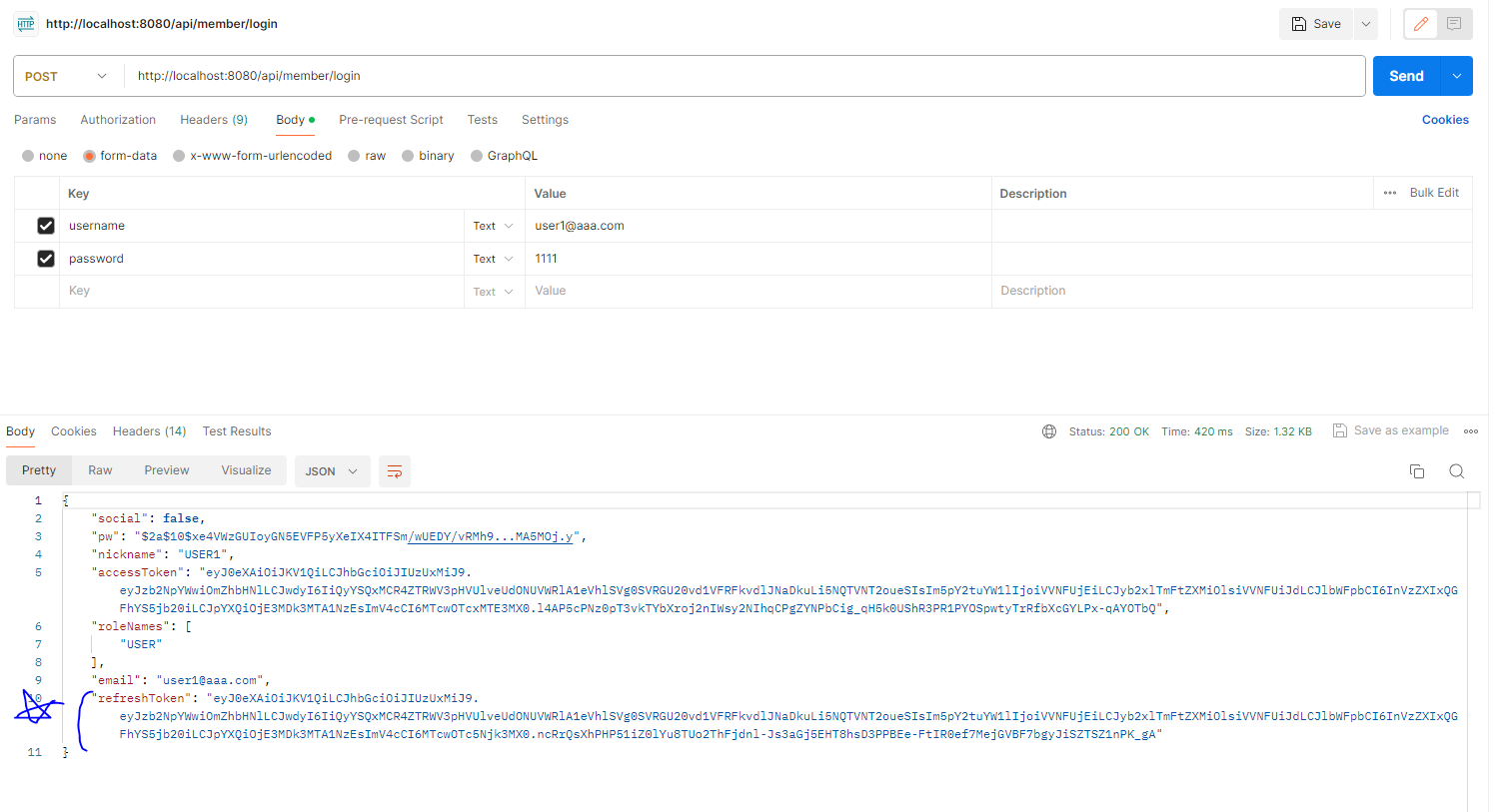 * /api/member/refresh 경로로 동작하는 APIRefreshController는 만료된 AccessToken과 만료되지 않은 Refresh Token이 필요하다. 이를 테스트하기 위해서 /api/member/login 에서 user1@aaa.com/1111 로 로그인 테스트를 먼저 진행한다.