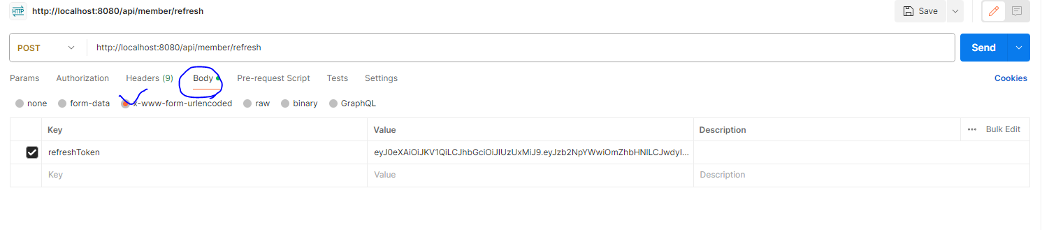 * 화면에서 생성된 accessToken과 refreshToken으로 /api/member/refresh 경로를 호출한다. Access Token은 이전과 마찬가지로 Authorization 헤더로 'Bearer 토큰' 의 형태로 지정하고, Refresh Token은 refreshToken이라는 파라미터로 전달한다. 전달하는 방식은 GET/POST 모두 가능하다.