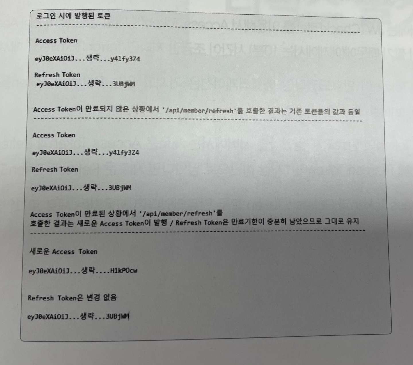 * 프로젝트에서는 /api/member/refresh 라는 경로를 통해서 Access Token 과 Refrech Token 을 검증하고 Access Token이 만료되었고, Refresh Token이 만료되지 않았다면 새로운 Access Token을 전송해 주는 기능을 구현한다.