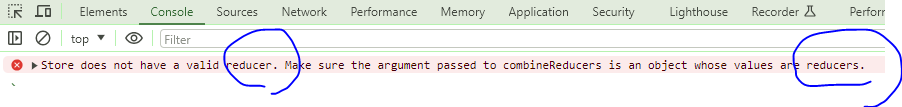 * 이 상태에서 프로젝트를 실행해 보면 개발자 도구 내에서 에러가 발생하는데 원인은 스토어의 설정은 되었지만 아직 상태 데이터 관리를 담당하는 리듀서가 없기 때문이다.