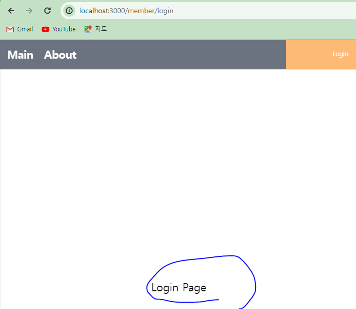 * 브라우저에서 오른쪽 상단의 Login 메뉴를 클릭하면 /member/login 경로로 이동하고 LoginPage가 출력된다.