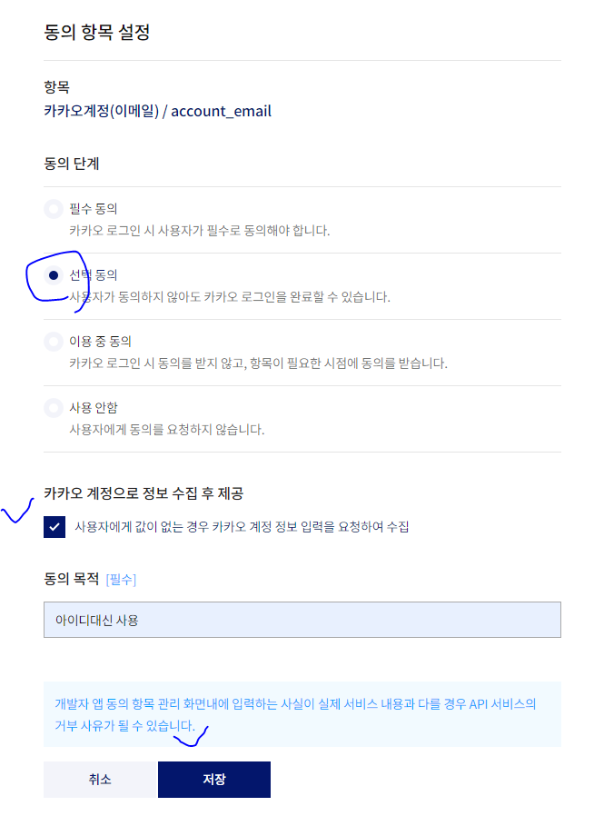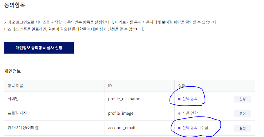 * 로그인 시에 동의 항목은 카카오 로그인 후에 전달되는 사용자 정보를 의미한다. 예제에서는 이 중에서 '닉네임'과 '카카오 계정(이메일)'을 설정해서 사용할 것이다.