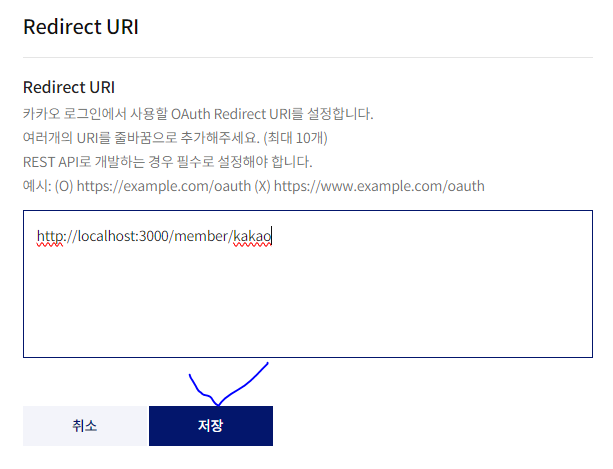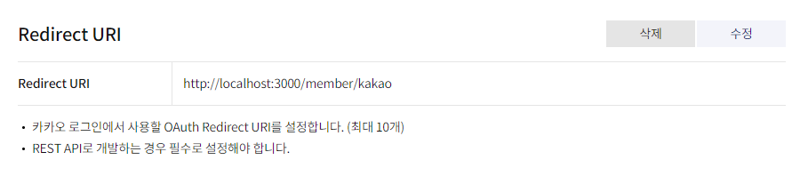 * 로그인 설정에서 가장 중요한 부분은 카카오의 인증 결과를 받는 'Redirect URI'의 설정이다. 예제는 리액트 쪽으로 인가 코드를 전달받을 것이므로 'http://localhost:3000/member/kakao' 로 설정한다.