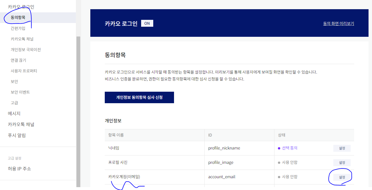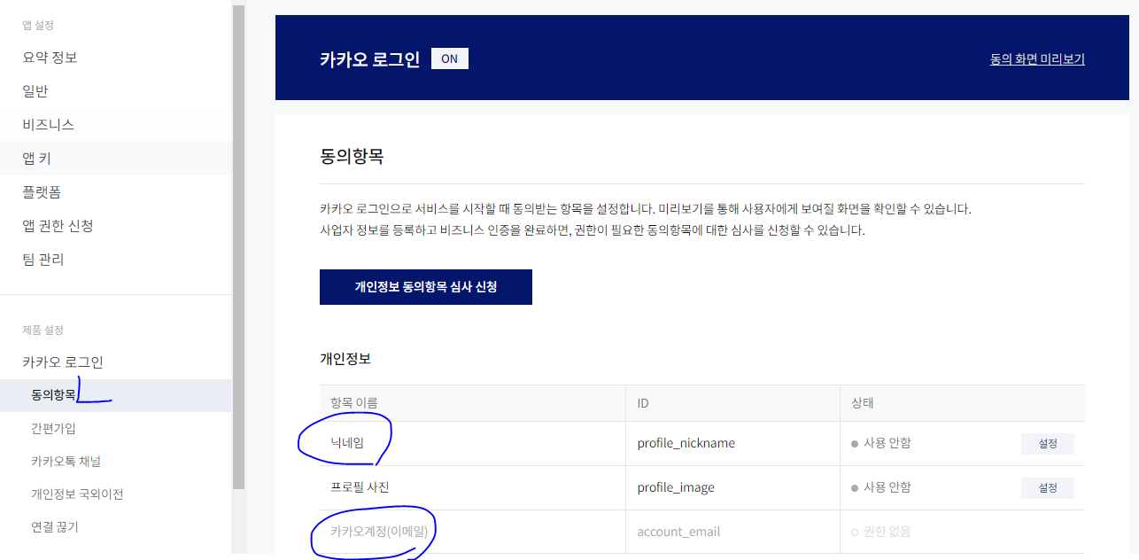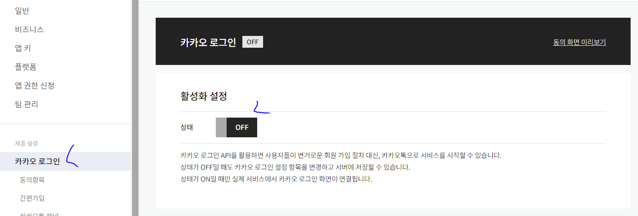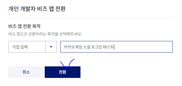 * 그 전에 비즈 앱 전환 시에만 카카오계정이 활성화 되므로 먼저 비즈앱 신청부터 시작해야 한다.