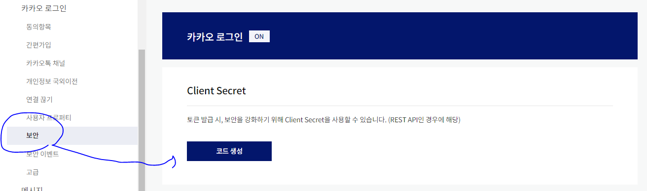 * 설정의 마지막 단계에서는 애플리케이션에서 사용할 비밀 키를 생성하는 부분이다. '보안' 항목에서 '코드 생성'을 이용해서 보안 코드를 생성한다. 보안 코드는 API 서버에서 사용할 수 있는 코드값이다.