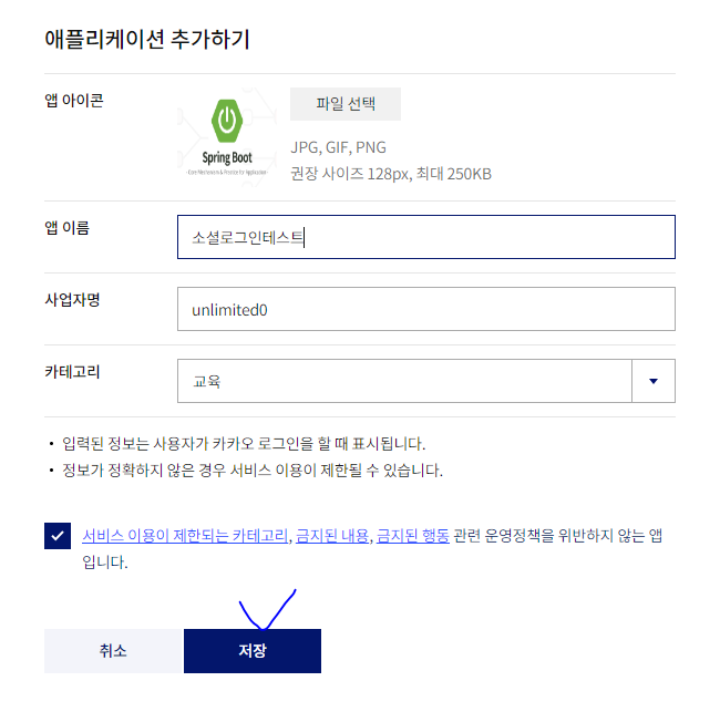 * 카카오 로그인에 필요한 정보를 이용해서 로그인 후에 '애플리케이션 추가하기' 메뉴를 선택한다.