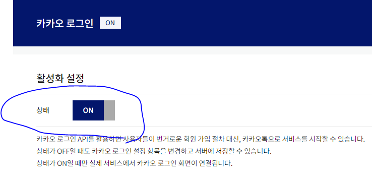 * 개발하려는 애플리케이션에서 카카오 로그인을 사용하려면 왼쪽 메뉴에서 '카카오 로그인'을 선택해서 활성화시켜 준다.