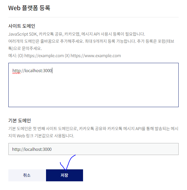 * Web 플랫폼 등록에서는 서버 주소와 포트를 지정하는데, 로컬 환경은 http://localhost:3000으로 지정한다(나중에 다른 주소 역시 추가 가능).