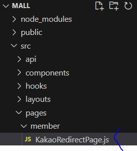 * 리액트 애플리케이션에서 Redirect Uri로 전달되는 경로가 없으므로 pages/member 폴더에 KakaoRedirectPage.js 를 추가한다.