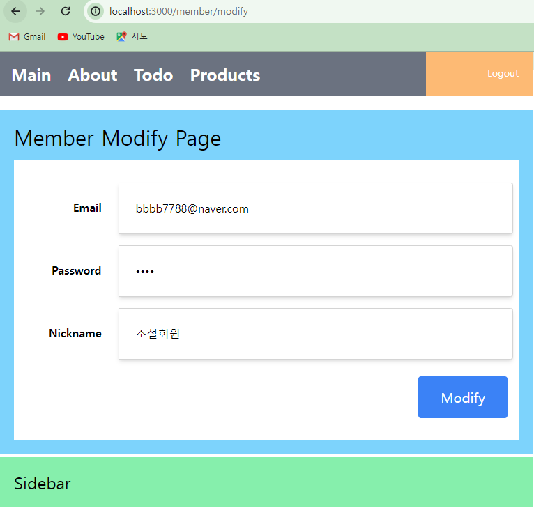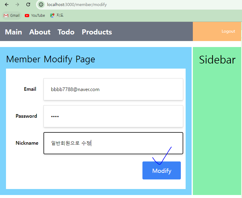* 화면을 구성하는 components/member/ModifyComponent에서는 modifyMember()를 호출하도록 수정한다.