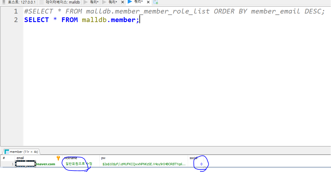 * 브라우저에서 카카오 로그인 후 에 회원정보를 수정해 보자. 화면에는 변화가 없지만 데이터베이스에는 변경된 내용을 확인할 수 있는데 특히 기존에 소셜 회원(social) 속성값이 변경된 것을 볼 수 있다.