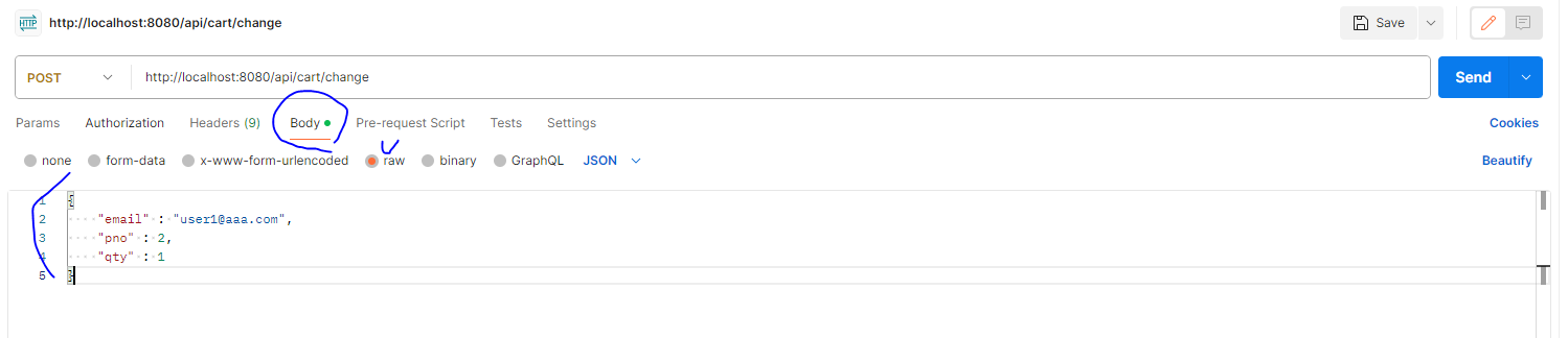 * 만일 장바구니 아이템 번호가 전달되면 이를 이용하므로 상품번호는 없어도 무방하다. 예를 들어 아래의 왼쪽과 같이 3번 아이템의 수량(qty)을 변경하고자 했다면 아래의 그림과 같이 cino 값을 전달하면 된다.