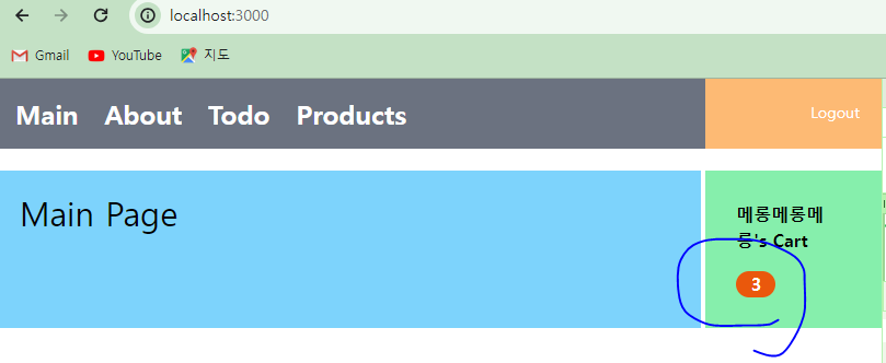 * API 서버의 호출이 확인되었다면 화면에 현재 화면에 장바구니 아이템의 숫자를 출력해 보도록 한다. 예를 들어 아래와 같이 현재 사용자가 2개의 장바구니 아이템이 있다면 화면에 2를 출력하도록 구성해 본다.