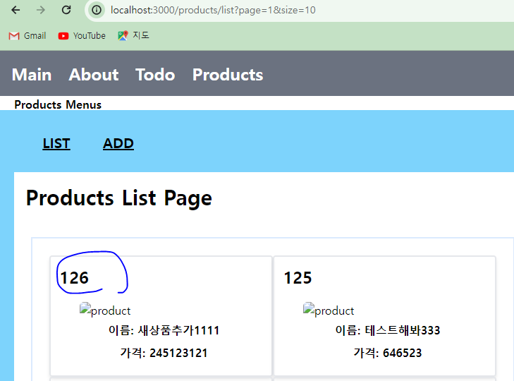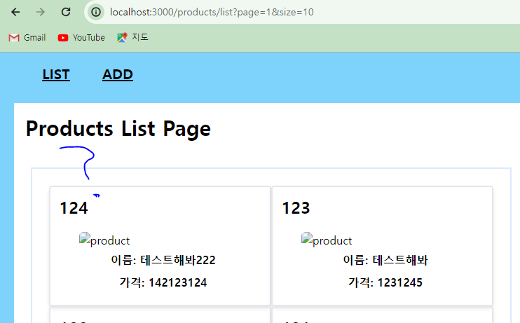 * 125번으로 새로운 상품이 등록되었고, 모달창을 닫아서 목록 화면으로 이동하게 되는데 이 경우 125번 상품은 아직 보이지 않고 124번까지만 보이는 것을 확인할 수 있다.