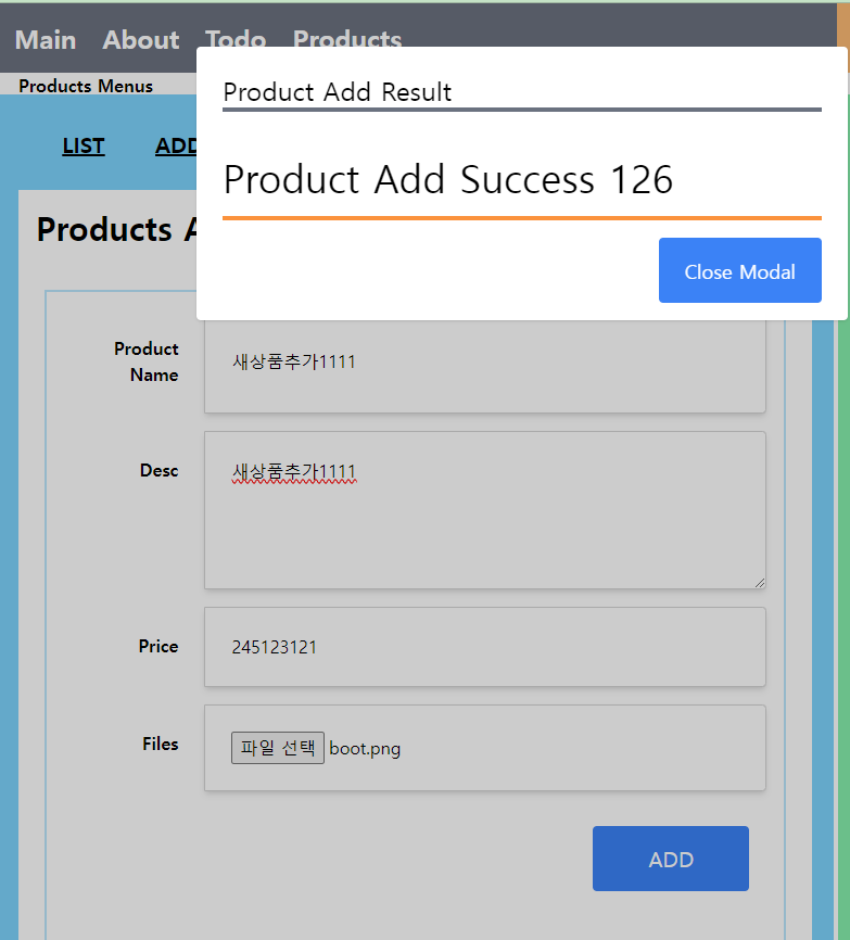 * 브라우저에서 새로운 상품을 등록하면 처리 중인 경우와 처리 후 모달창이 보이게 된다.