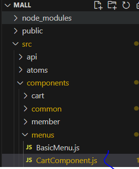 * components/menus/CartComponent는 리액트 쿼리와 리코일로 처리된 useCustomCart를 이용하고 리코일의 Seletor로 만든 총액(total)을 보여주도록 한다.