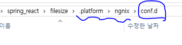 * Ngnix 설정을 변경하기 위해서는 EC2 환경에 접속해서 /etc/ngnix 폴더에 있는 설정 파일을 수정하는 방법도 있지만, 예제에서는 별도의 명령어 없이 할 수 있는 방법으로 해 볼 것이다. Gradle을 이용해서 bootJar를 실행한 결과로 생성된 jar 파일을 특정한 폴더로 복사해 두고 .platform 폴더 내에 ngnix 폴더와 conf.d 폴더를 생성한다(폴더 이름에 .이 있으므로 주의).