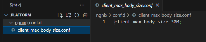 * 생성된 폴더에 client_max_body_size.conf 파일을 생성한다(파일 생성 시 확장자를 주의한다. VS Code 명령어로 생성한다).