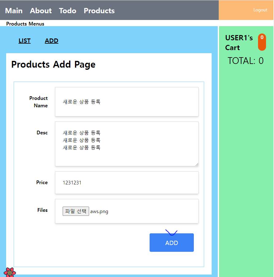 * Products 메뉴에서는 상품등록과 조회를 확인한다. 다만 생성된 환경에서의 ngnix의 기본 설정이 1MB로 제한되기 때문에 이미지 용량이 적은 파일 1개만 이용해야 한다(이에 대한 설정은 뒤쪽에서 진행한다).