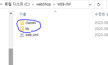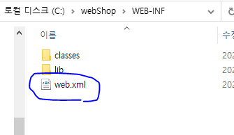* 지금 만든 웹 어플리케이션의 이름은 webShop 이고, 하위 디렉터리에는 WEB-INF가 있다. WEB-INF 폴더 하위에는 classes와 lib 폴더가 있고, web.xml 파일이 있다. 이것이 이 웹 어플리케이션을 이루는 요소들이다.