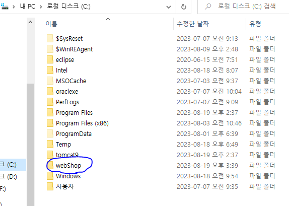 1. C 드라이브의 webShop 폴더 전체를 복사한 후 톰캣 루트 디렉터리의 하위에 있는 webapps 폴더에 붙여 넣는다.