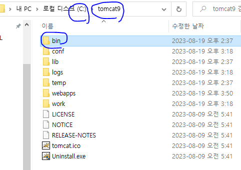 - 톰캣을 설치한 루트 디렉터리의 bin 폴더로 이동한다.