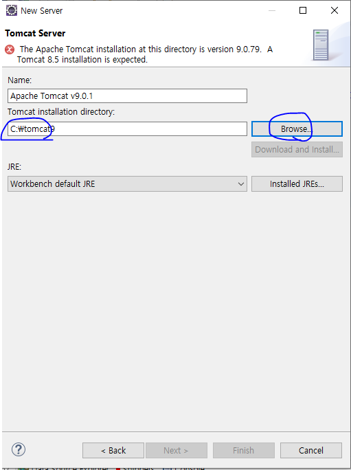 3. 톰캣 설치 디렉터리를 설정하기 위해 Browse...를 클릭하여 톰캣 홈 디렉터리(C://tomcat9) 경로를 선택한 후 폴더 선택을 클릭한다.