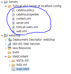 5. 이클립스에서 톰캣 컨테이너를 추가하면 다음과 같이 프로젝트 탐색기에 Servers 항목이 추가되면서 톰캣과 관련된 xml 파일들이 나타난다. 이클립스에서 톰캣 컨테이너를 설정할 때 톰캣 루트 디렉터리에 있던 여러 가지 xml 설정 파일들이 이클립스 Project Explorer 상단에 자동으로 복사된 것이다. 앞서 직접 편집기를 이용해서 실습했을 때 사용한 server.xml도 보인다.