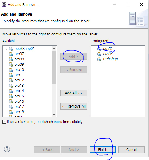 2. 추가할 프로젝트, 즉 여기서는 webShop을 선택한 후 Add를 클릭해 톰캣에 추가(등록)한다. 이어서 Finish를 클릭하여 등록을 마친다.