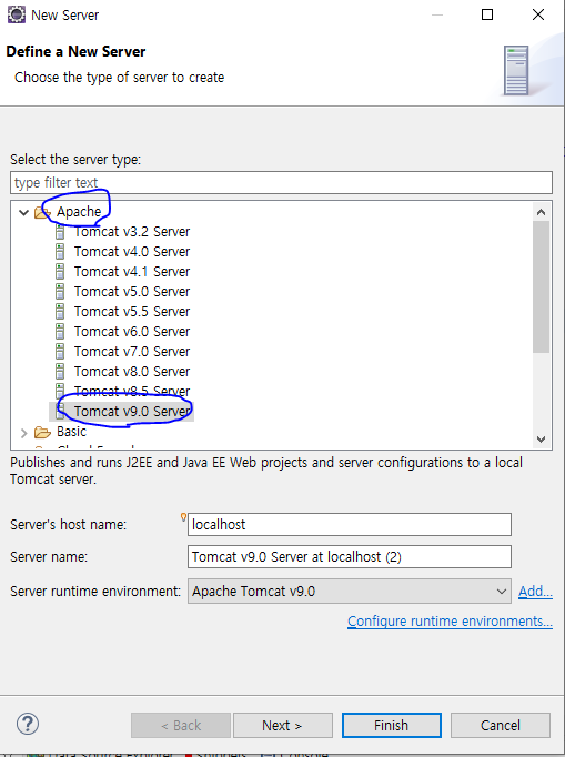 2. 서버 설정창의 Apache 항목에서 Tomcat v.9.0 Server를 선택한 후 Next를 클릭