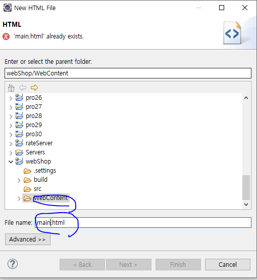 2. 파일 이름으로 main.html을 입력한 후 Finish를 클릭한다.