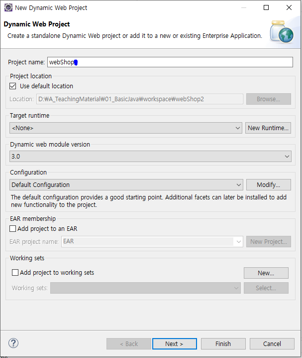 (2) 프로젝트 이름에 webShop이라고 입력한 후 Next를 클릭한다.