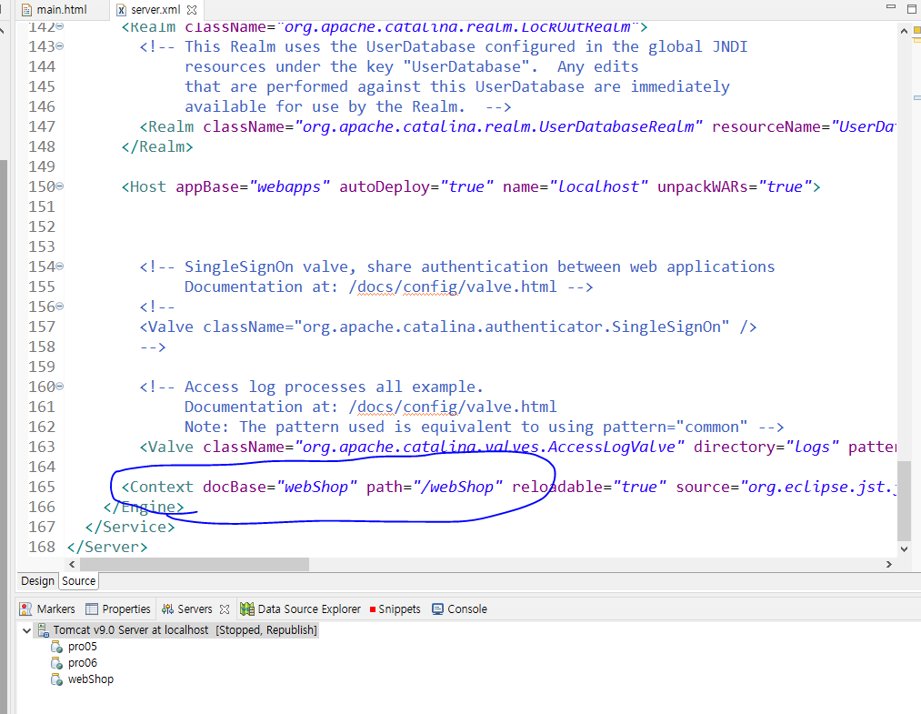 4. server.xml을 더블클릭하여 이클립스에서 열고 하단의 Source 탭을 클릭한다. 스크롤을 내려 <Context> 태그 부분을 보면 프로젝트에 대한 컨텍스트가 자동으로 추가된 것을 확인할 수 있다. 이클립스에서 자동으로 추가되는 컨텍스트 이름은 프로젝트 이름과 동일하게 설정된다. 여기서는 webShop으로 잘 등록된 것을 확인할 수 있다.