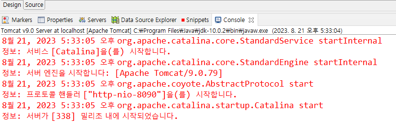 3. 다음과 같이 이클립스 Console 탭에 로그가 출력되면서 톰캣이 실행된다.