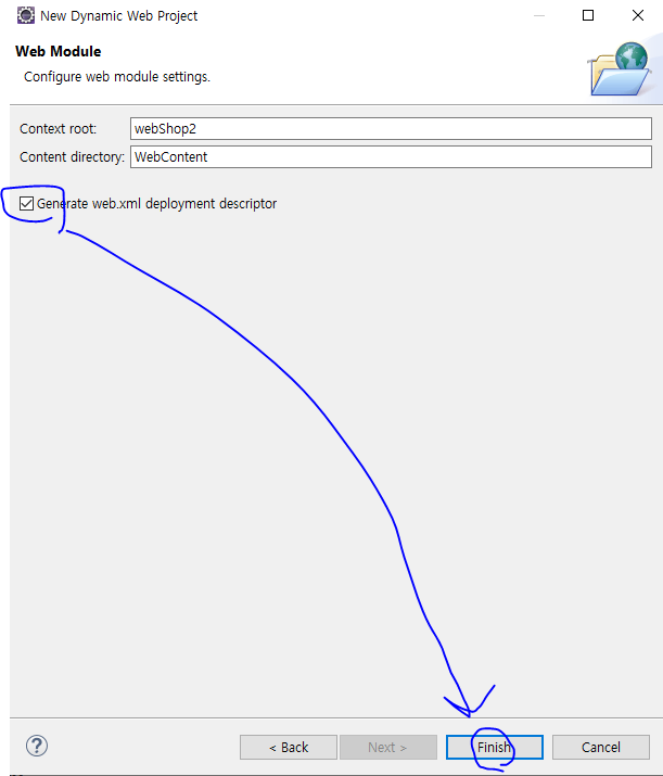 (4) web.xml을 생성할 것인지 묻는 체크박스에 체크한 후 Finish를 클릭.