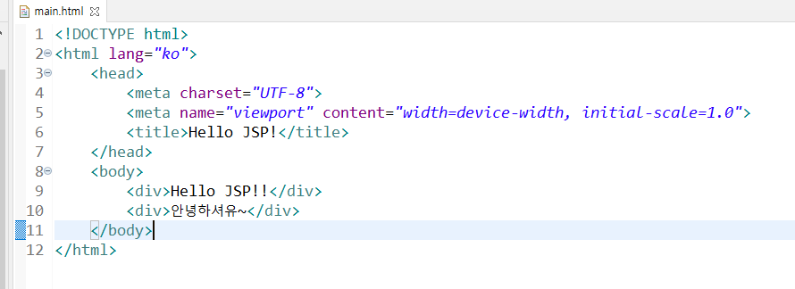 3. main.html 파일에 다음과 같이 간단한 HTML 코드를 작성한 후 Ctrl+S를 눌러 저장한다.