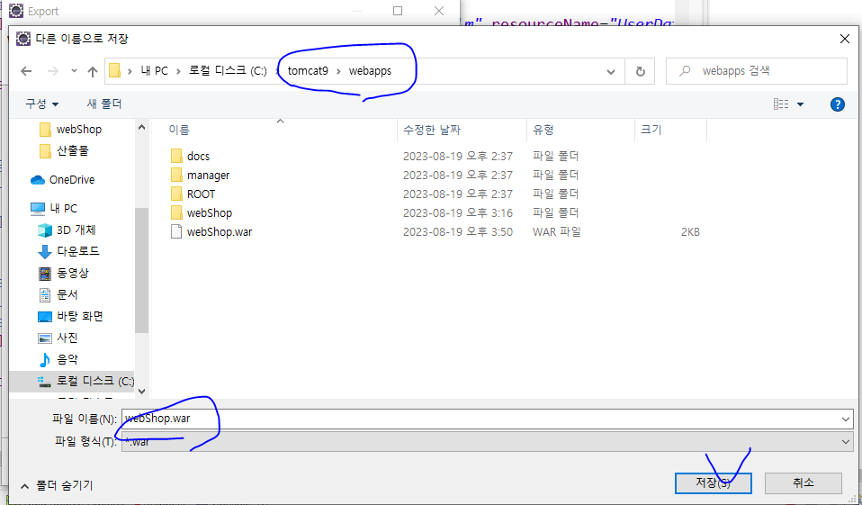 (4) 톰캣 폴더의 webapps 디렉터리를 지정하고 webShop.war라는 파일 이름으로 저장한다.
