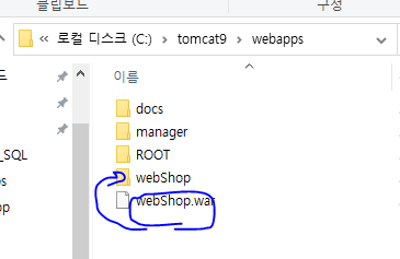 * 톰캣의 wabapps 폴더에 위치하는 웹 애플리케이션은 직접 server.xml에 등록하지 않아도 톰캣 실행 시 자동으로 등록된다. 따라서 webShop.war 를 미리 webapps 폴더에 위치시킨 후 톰캣을 실행하면 톰캣이 알아서 압축을 해제한 후 생성된 웹 어플리케이션을 자동으로 등록해 준다.